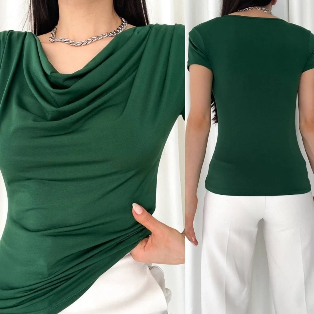 Kadın Vatkalı Omuzlar Pileli Kısa Kol Sandy Kumaş Bluz