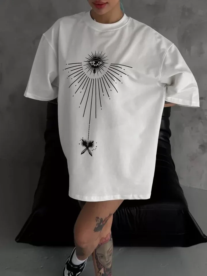 Unisex Bisiklet Yaka Baskılı Oversize T-Shirt - Beyaz