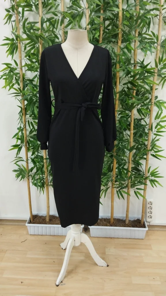 Kadın Uzun Kollu Kruvaze Yaka Belden Kuşaklı Midi Ithal Krep Elbise