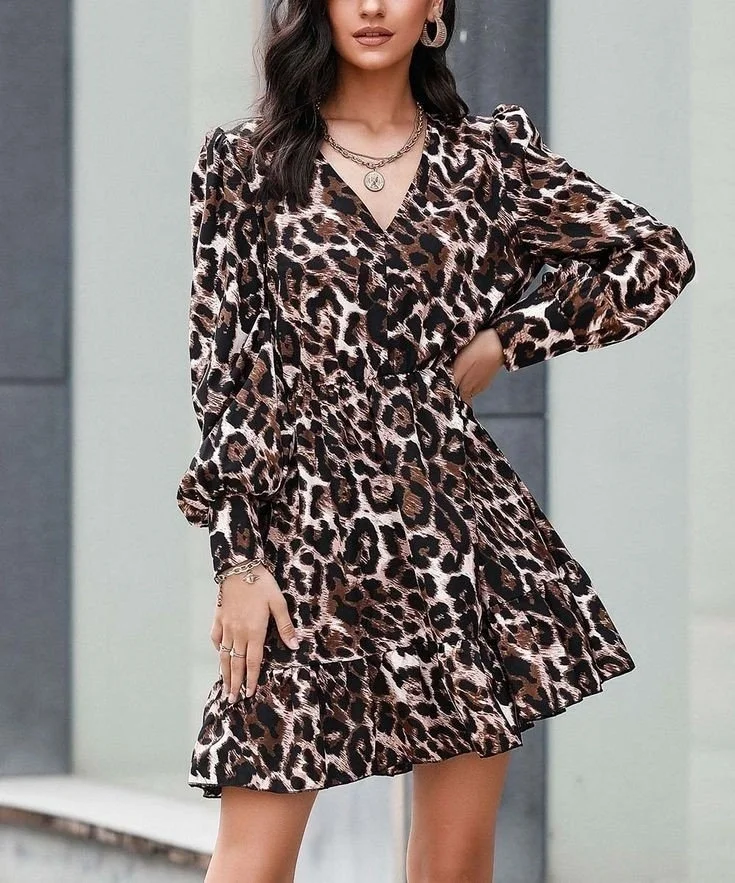 Kadın Uzun Kollu Beli Lastikli Etek Ucu Volanlı Leopar Desen Krep Elbise
