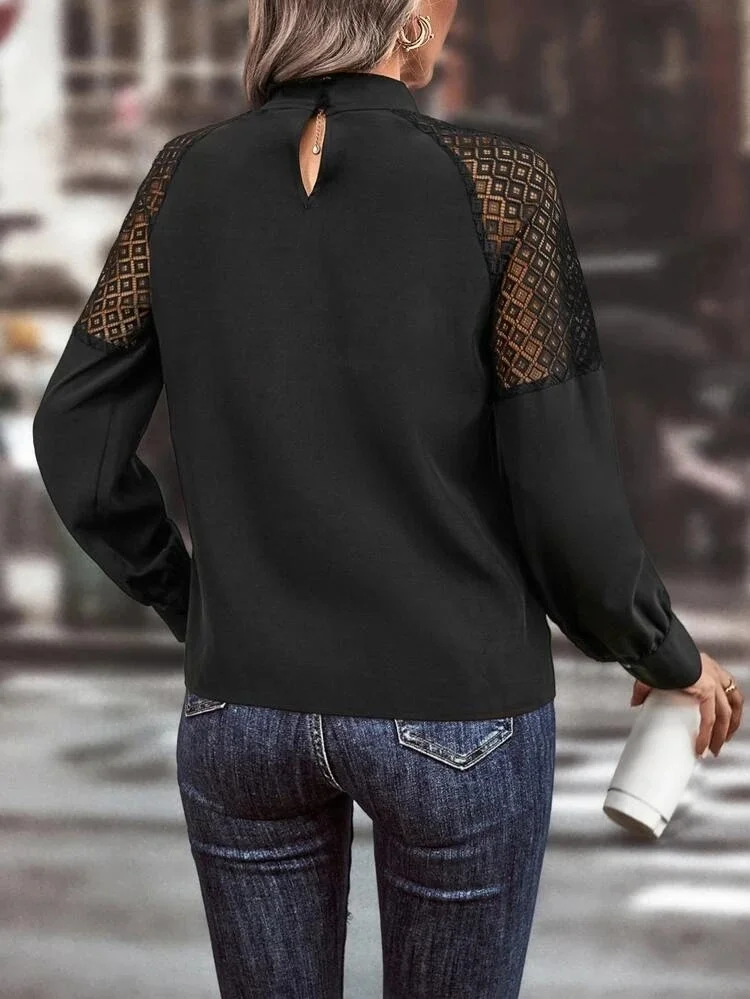 Kadın Uzun Kollu Anahtar Deliği Yaka Reglan Kol Dantel Detaylı Ithal Krep Bluz
