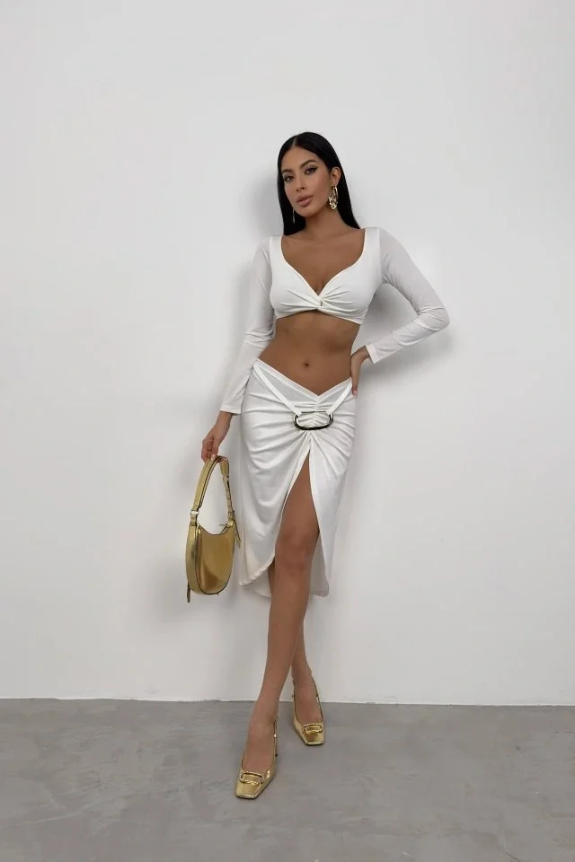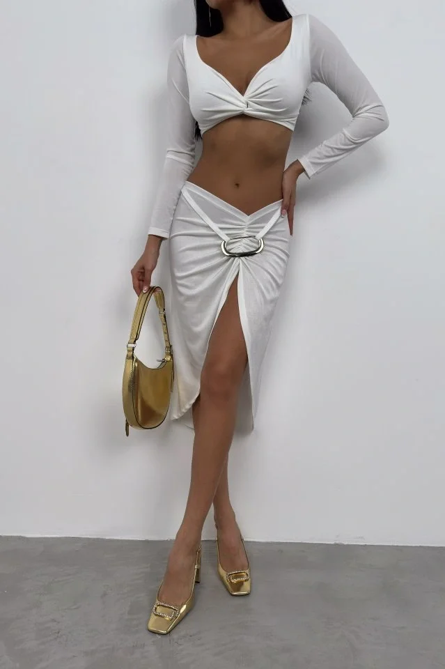 Kadın Kısa Kollu V Yaka Fular Detay Merserize Triko Bbluz
