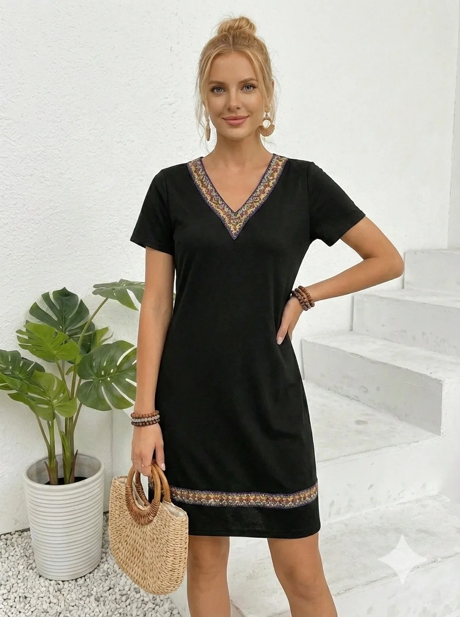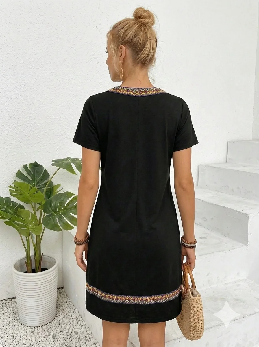 Kadın Kısa Kollu V Yakalı Etnik Desen şerit Detaylı Viskon Elbise