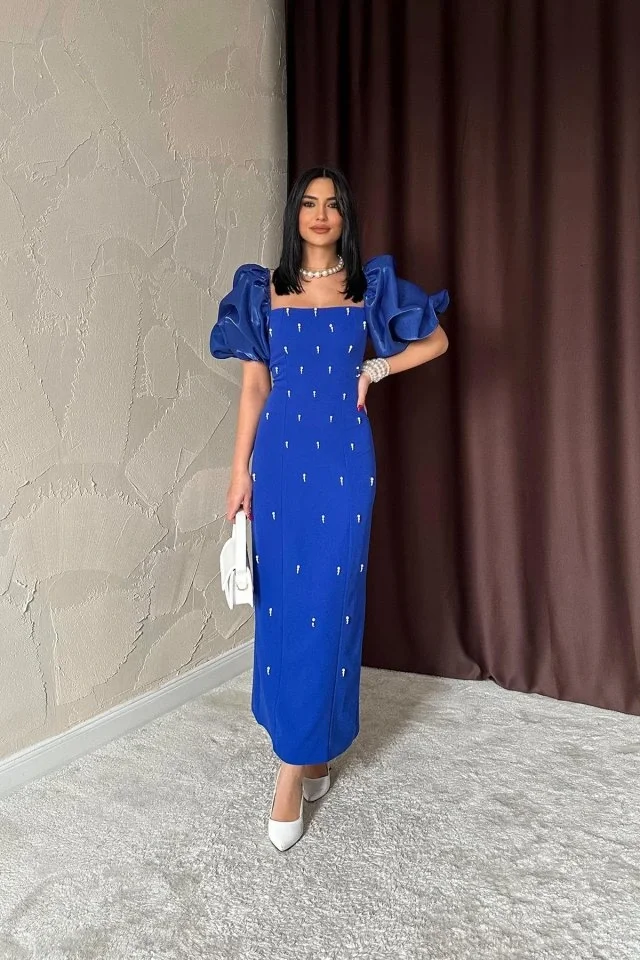 Saks İşlemeli Kolu Garnili Elbise