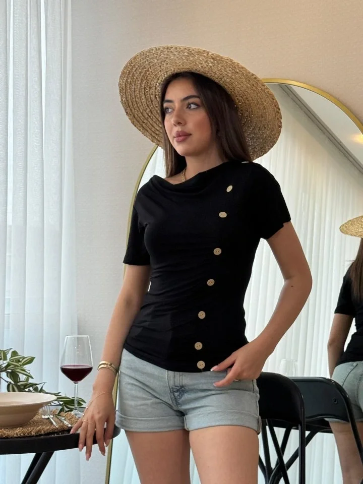 Kadın Kısa Kollu Degaje Yaka Düğme Detay Viskon Bluz