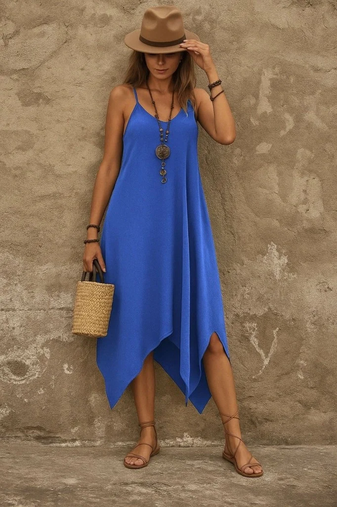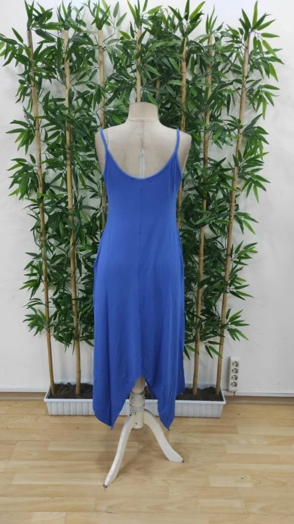 Kadın Askılı V Yakalı Cep Detaylı Asimetrik Kesim Viskon Elbise