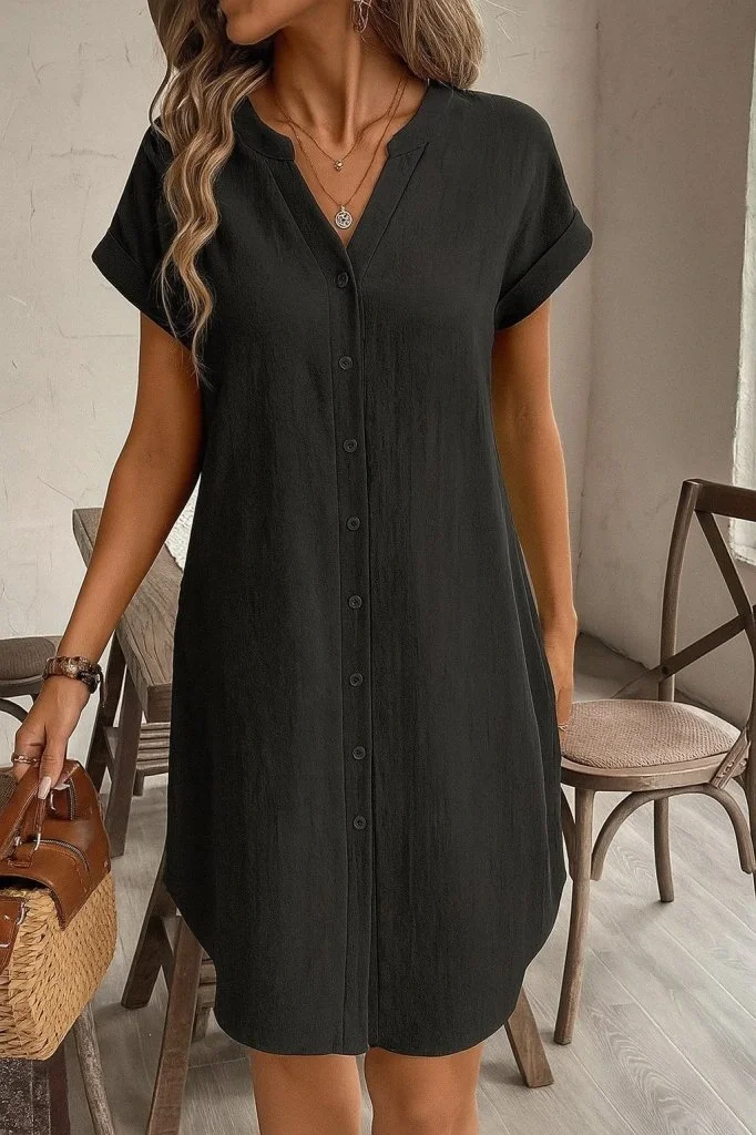 Kadın Kısa Kollu önden Düğmeli Ithal Keten Elbise