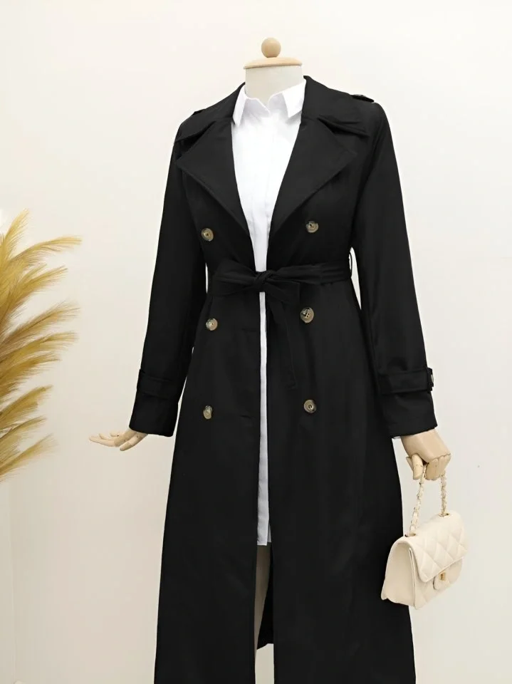 5939 Astarlı Uzun Trençkot - Siyah