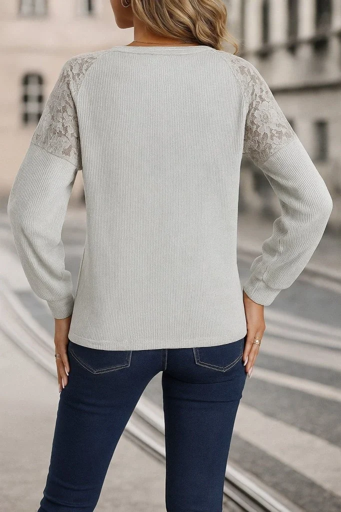 Kadın Uzun Kollu V Yakalı Dantelli Waffle Bluz
