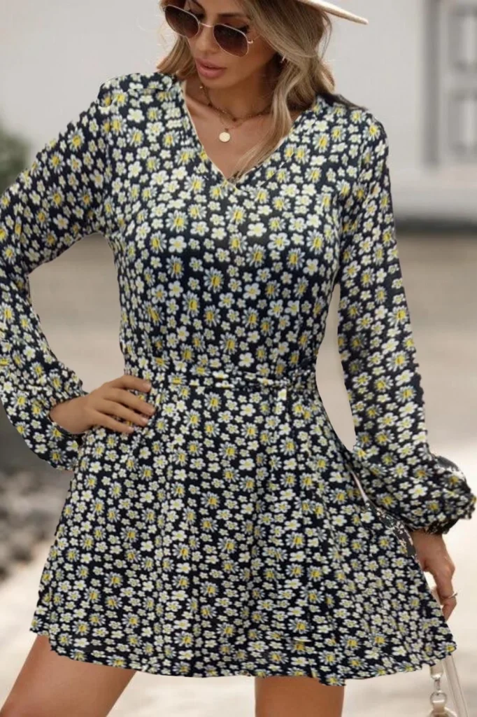 Kadın Uzun Kollu V Yaka çiçek Desenli Helen Kumaş Elbise