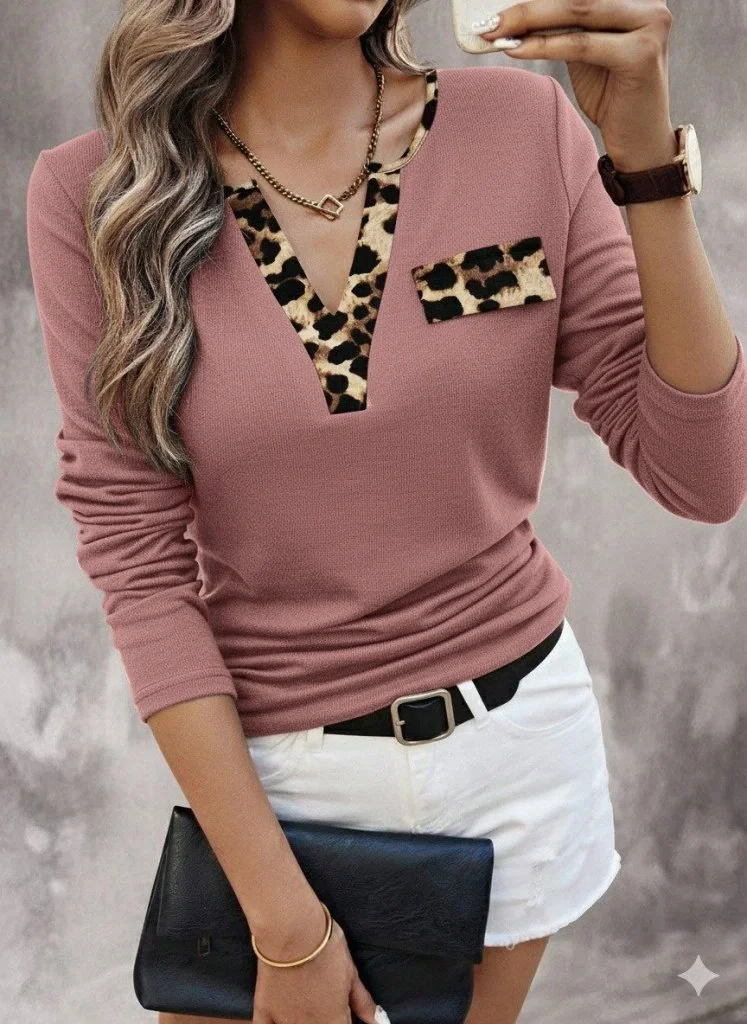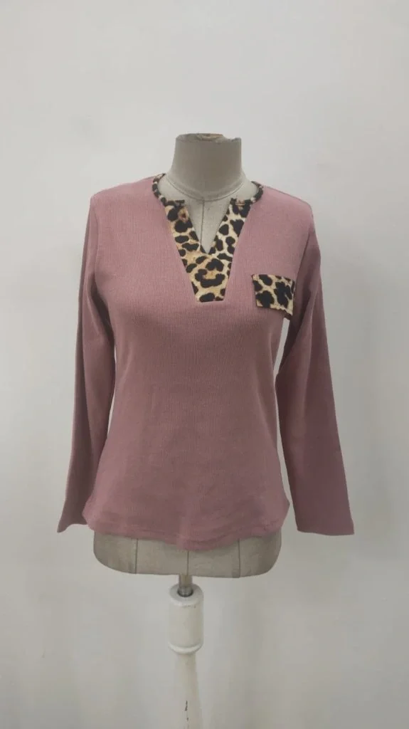 Kadın Leopar Desen Fermuar Detay Viskon Kumaş Bluz