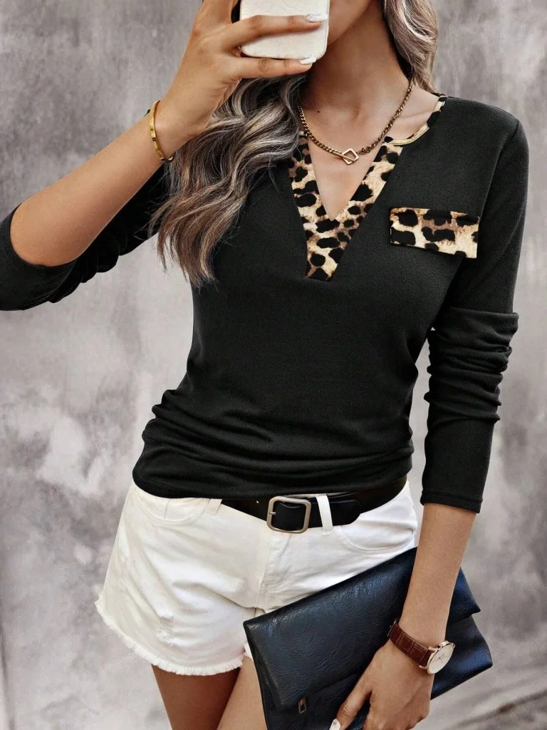 Kadın Uzun Kollu V Yakalı Leopar Detaylı Viskon Iki Iplik Bluz
