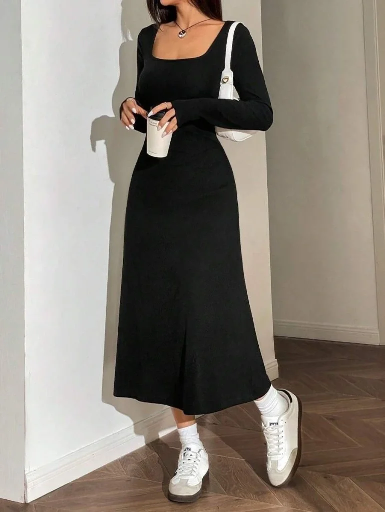 Kadın Uzun Kollu Kare Yaka Midi Kaşkorse Elbise