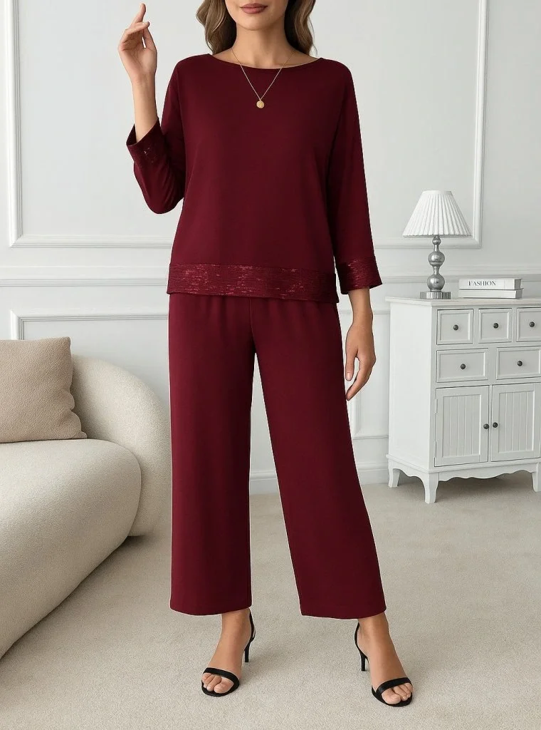 Kadın Uzun Kollu Bisiklet Yaka Pulpayetli Viskon Iki Iplik Bluz Ve Pantolon Ikili Takım