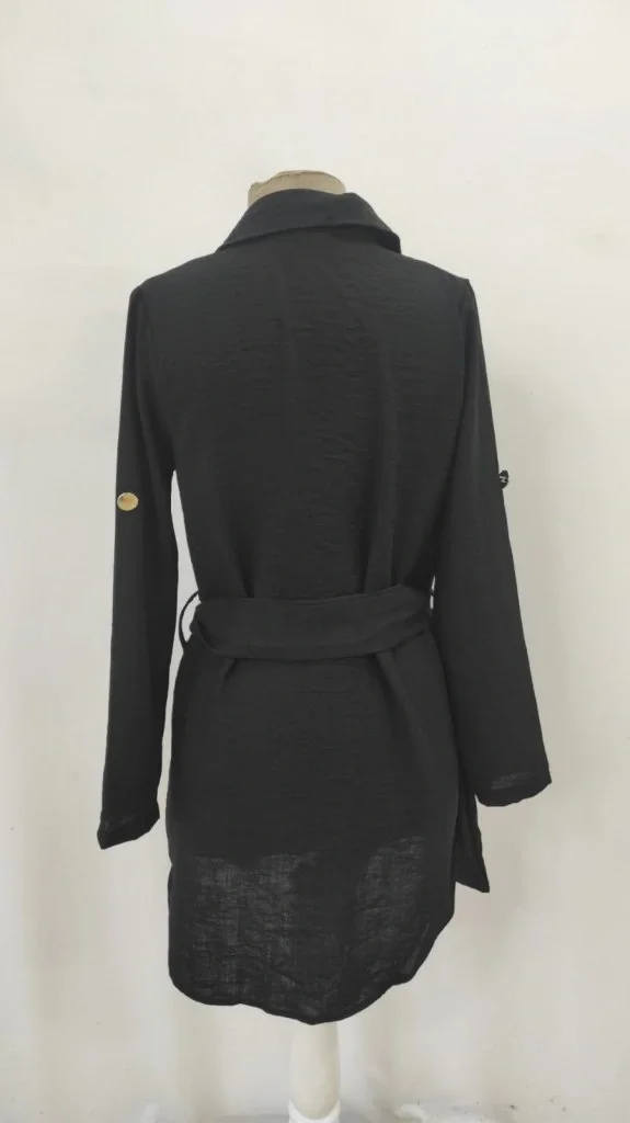 Kadın Uzun Kollu Yakalı önden Düğmeli Beli Kuşaklı Mini Ithal Keten Elbise