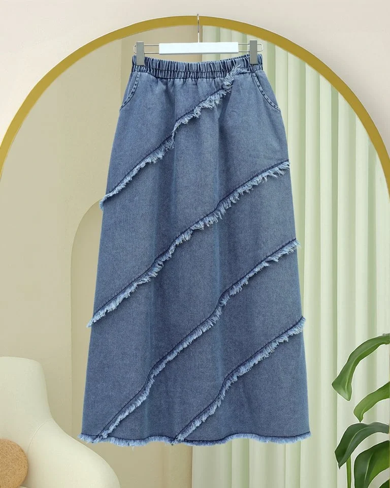 Püskül Detaylı Beli Lastikli Kot Etek -Mavi