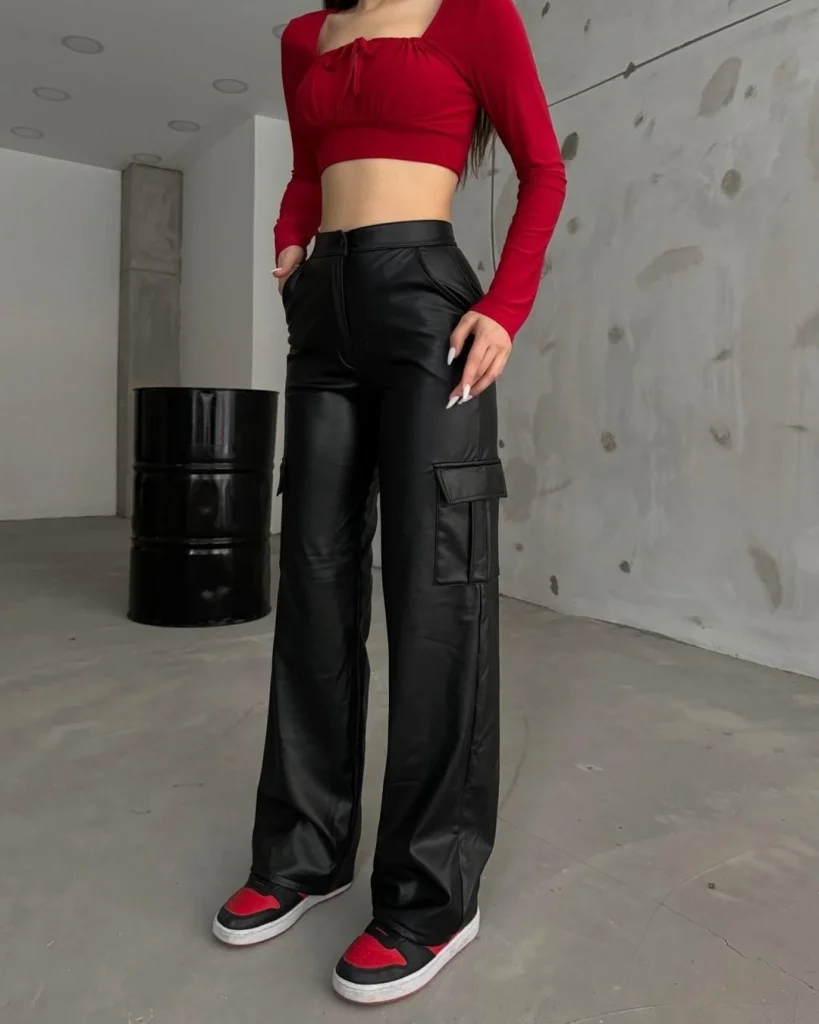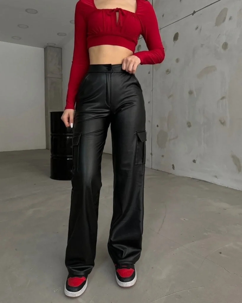 Kadın Yüksek Bel önden Fermuarlı Yandan Cep Detaylı Deri Kargo Pantolon