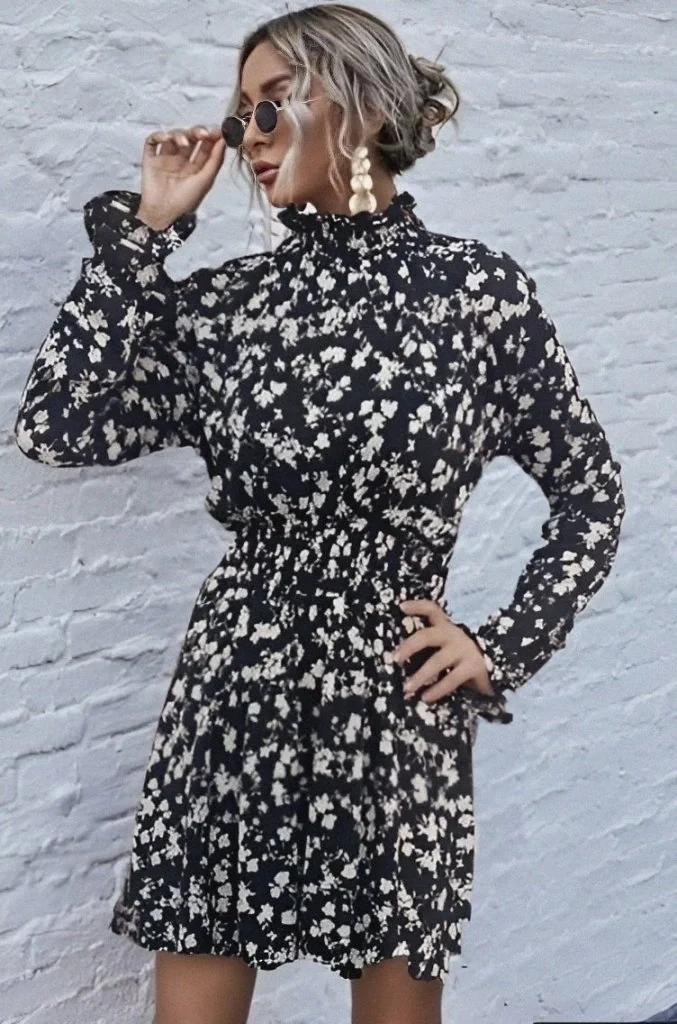 Kadın Uzun Kollu Balıkçı Yaka çiçek Baskılı Helen Kumaş Elbise