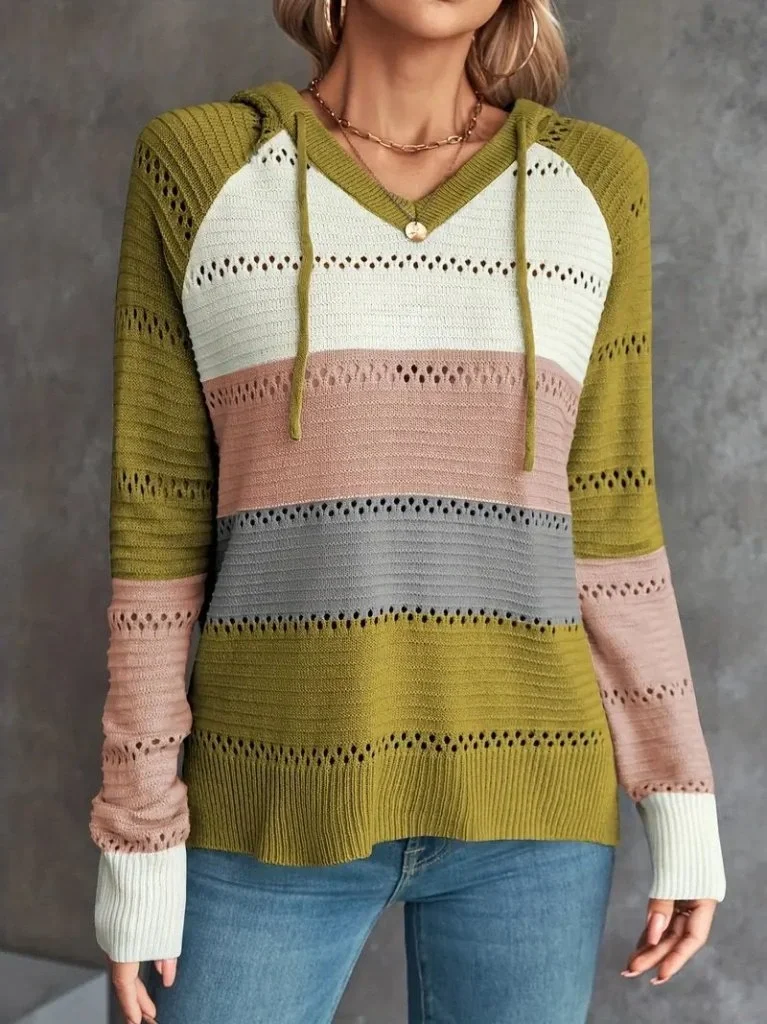 Kadın Uzun Kollu V Yakalı Bağcıklı Kapşonlu Triko Bluz