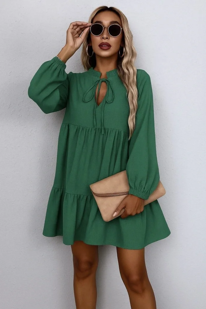 Kadın Uzun Kollu Yakadan Bağcıklı Fırfırlı Keten Mini Elbise