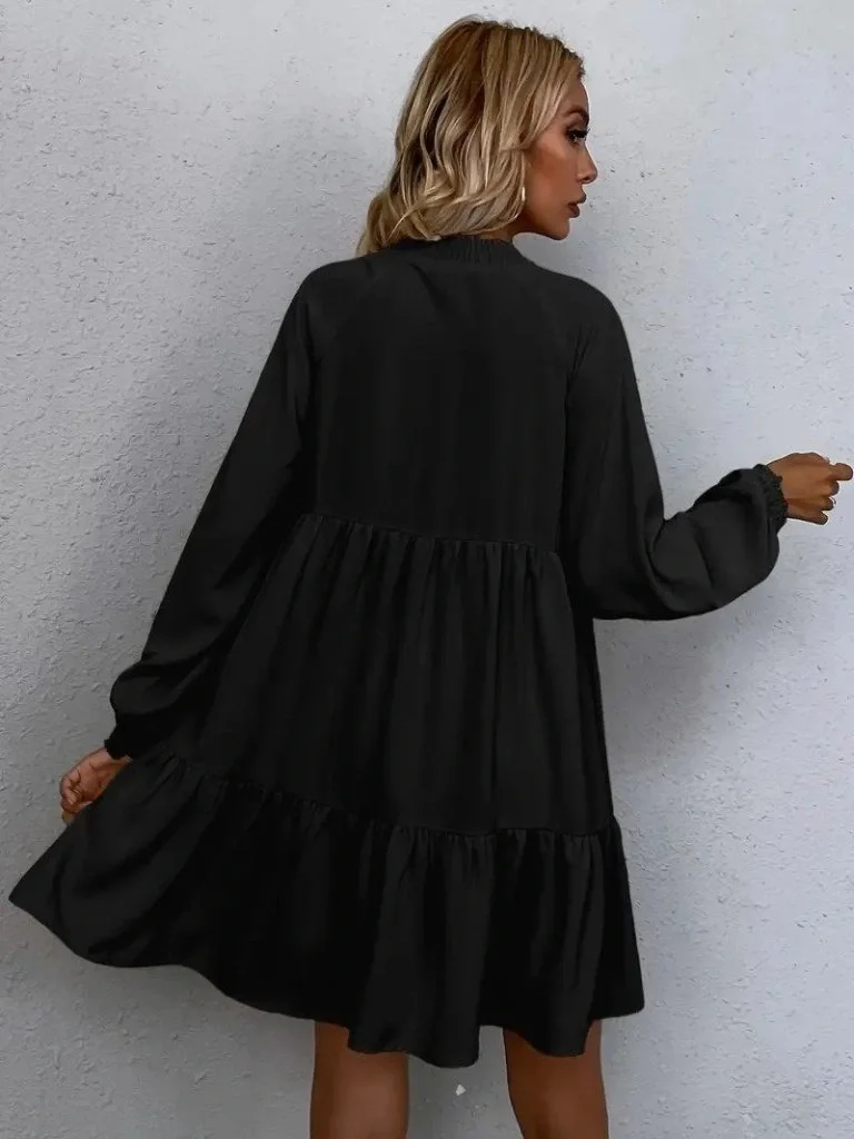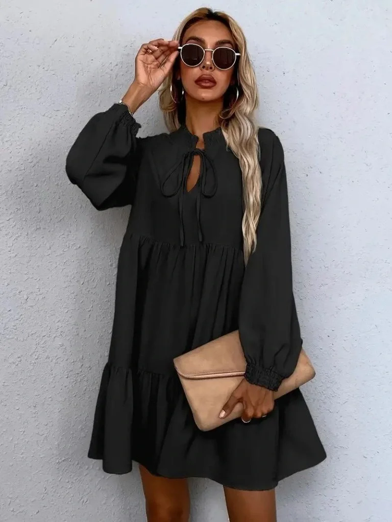 Kadın Uzun Kollu Yakadan Bağcıklı Fırfırlı Keten Mini Elbise
