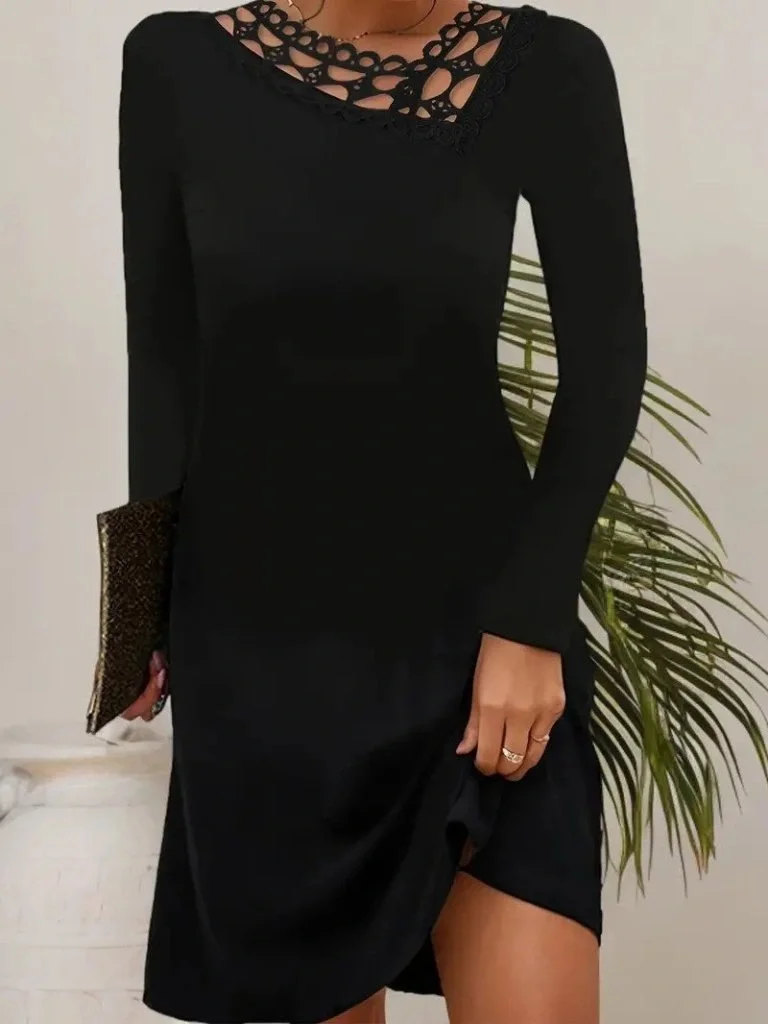 Kadın Uzun Kollu Dantel Yaka Ithal Krep Mini Elbise
