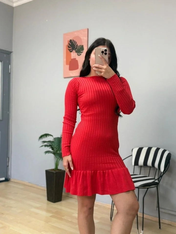 Kadın Bisiklet Yaka Uzun Kol Etek Ucu Fırfırlı Triko (polyenit) Mini Boy Elbise