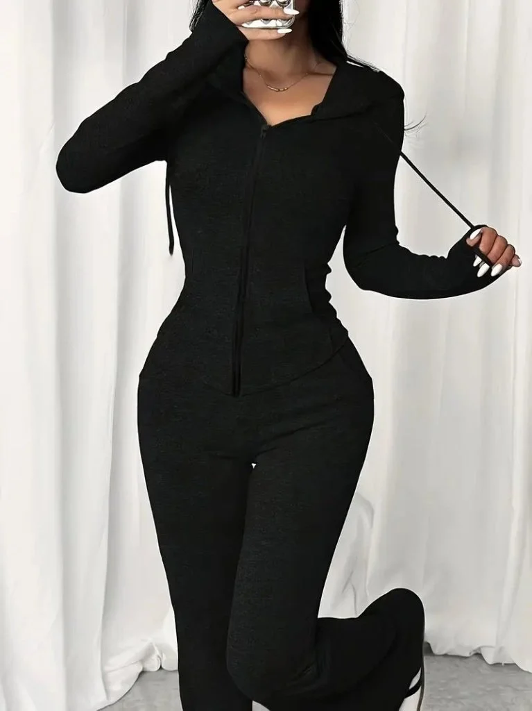 Kadın Uzun Kollu Kapşonlu Bağcıklı önü Fermuarlı Viskon Iki Iplik Bluz Ve Pantolon Ikili Takım