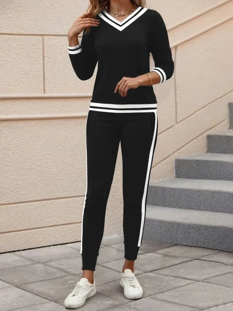 Kadın Uzun Kollu V Yakalı Ribanalı Viskon Iki Iplik Bluz Ve Pantolon Ikili Takım