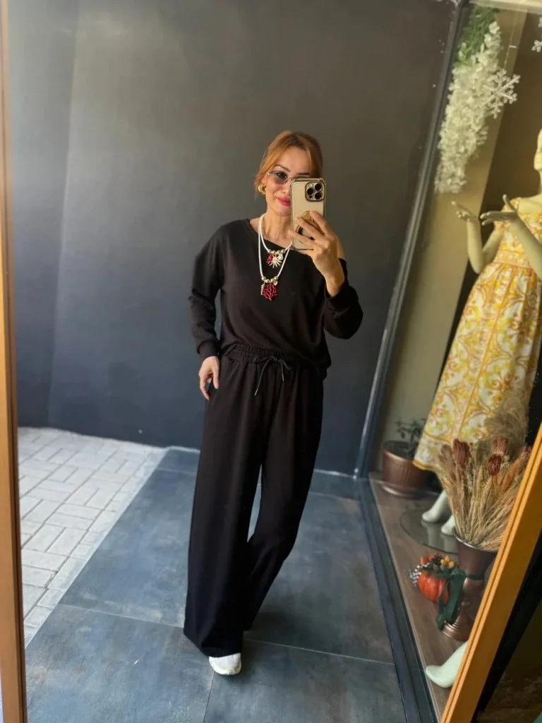 Kadın Uzun Kollu Bisiklet Yaka Asimetrik Kesim Bluz şardonlu Kaşkorse Bluz Ve Pantolon Ikili Takım