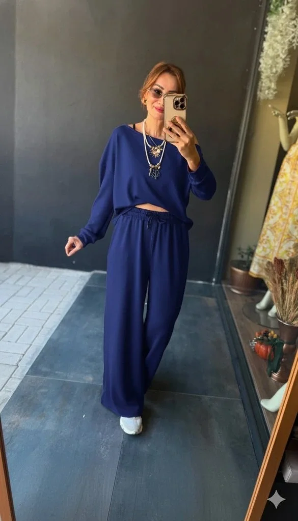 Kadın Uzun Kollu Bisiklet Yaka Asimetrik Kesim Bluz şardonlu Kaşkorse Bluz Ve Pantolon Ikili Takım