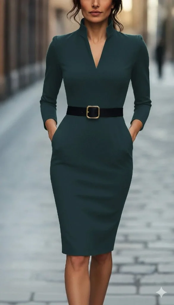 Kadın Uzun Kollu Hakim Yaka Beli Kemerli Cepli Midi Ithal Krep Elbise