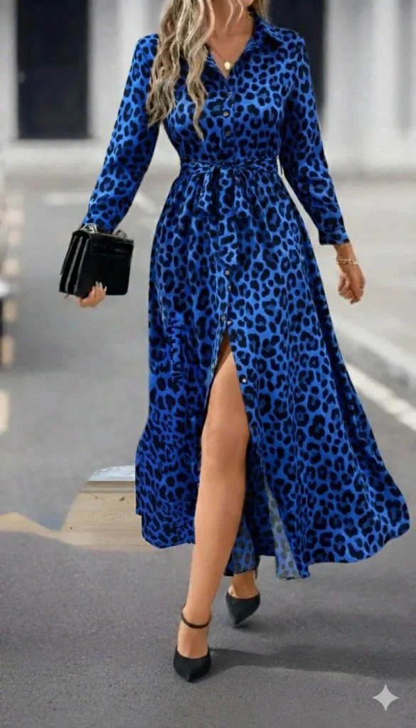 Kadın Uzun Kollu Yakalı Belden Kuşaklı Leopar Desenli Modal Uzun Elbise