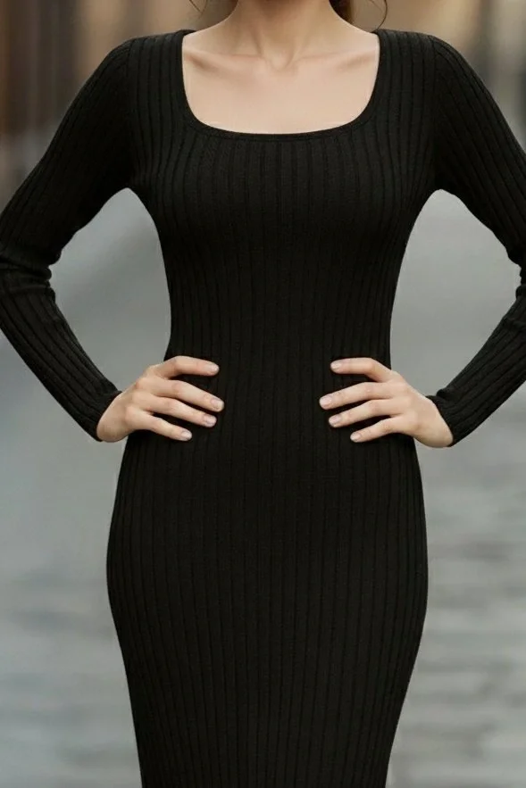 Kadın Uzun Kollu Kalp Yakalı Midi Ithal Krep Elbise