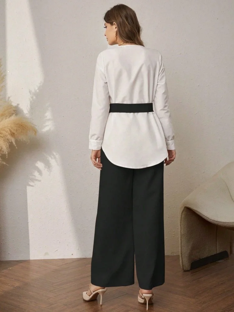 Kadın Uzun Kollu şal Detaylı Bluz Ve Pantolon Kemer Dahil Ikili Takım