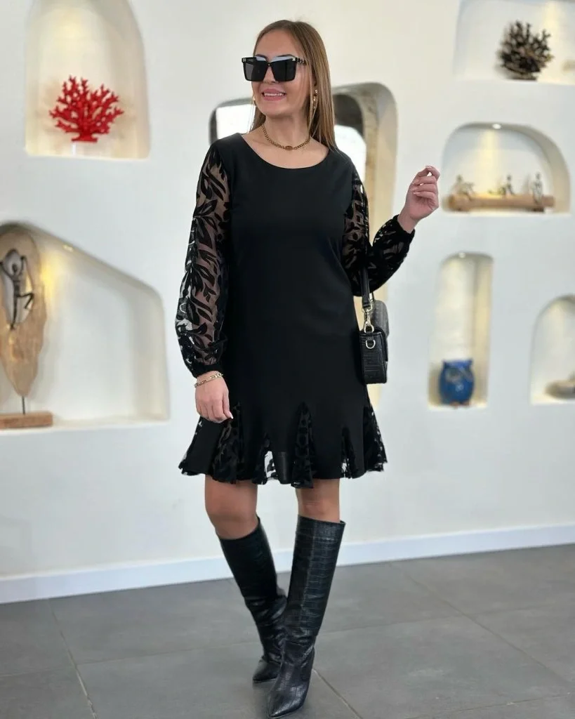 Kadın Uzun Kollu Yuvarlak Damla Detaylı Kolları Tül Detaylı Kısa Ithal Krep Elbise