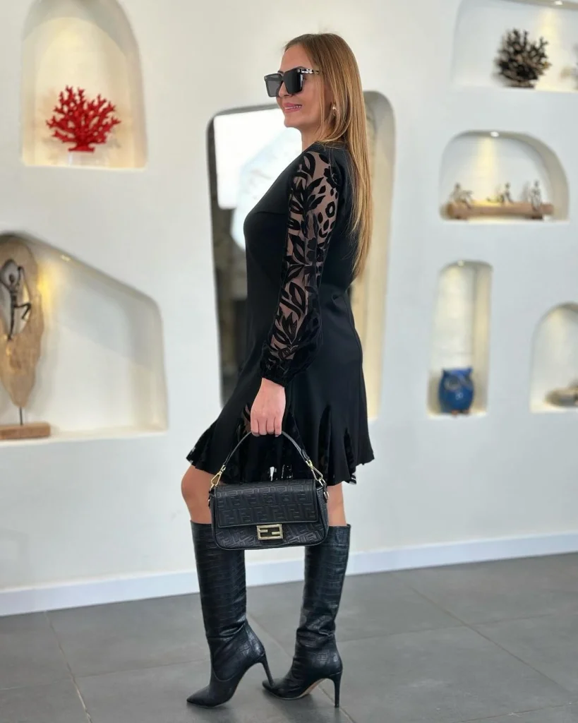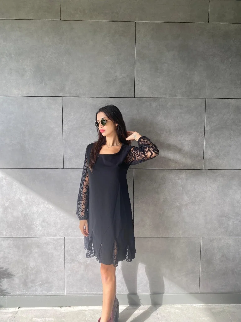 Kadın Uzun Kollu Yuvarlak Yaka Kol Ve Etek Ucu Dantelli Kısa Ithal Krep Elbise