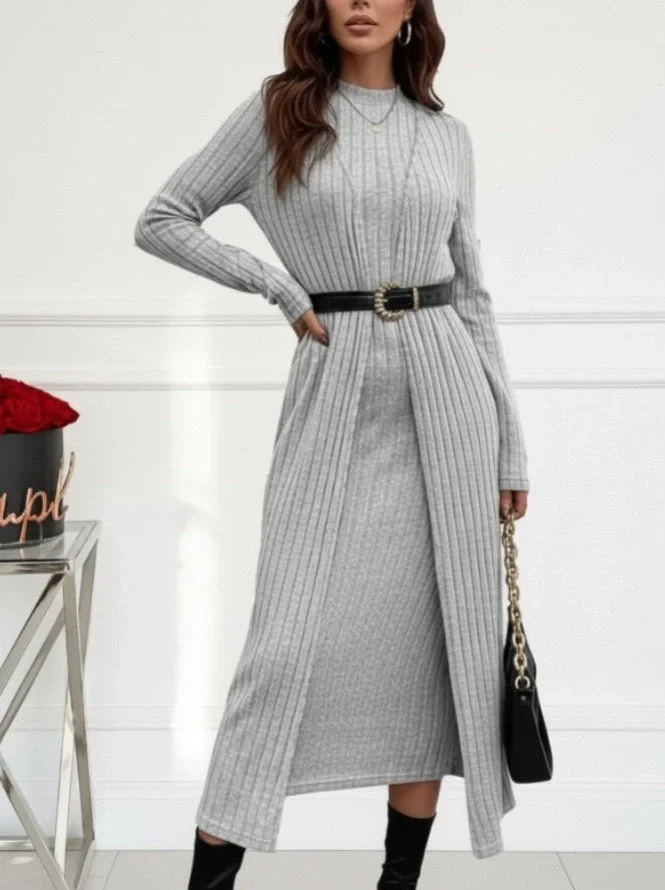 Kadın Uzun Kollu Yarı Balıkçı Yaka şardonlu Kaşkorse Elbise Ve Uzun Hırka Ikili Takım