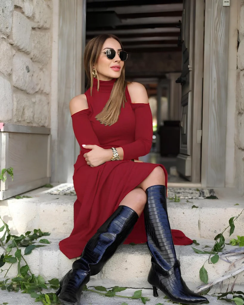 Kadın Balıkçı Yaka Omuzlardan Açık Uzun Kollu Janjan Krep Elbise