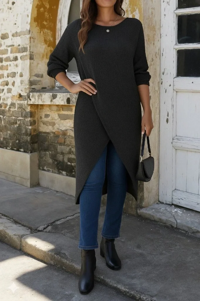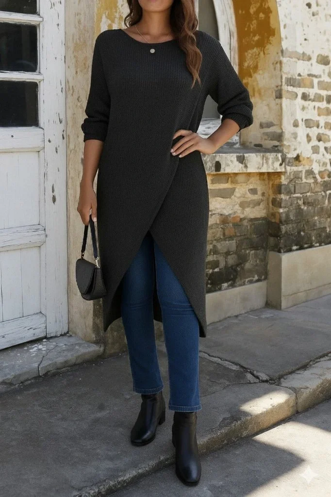 Kadın Uzun Kollu Bisiklet Yakalı önden çapraz Kesim Detaylı Midi Triko Elbise