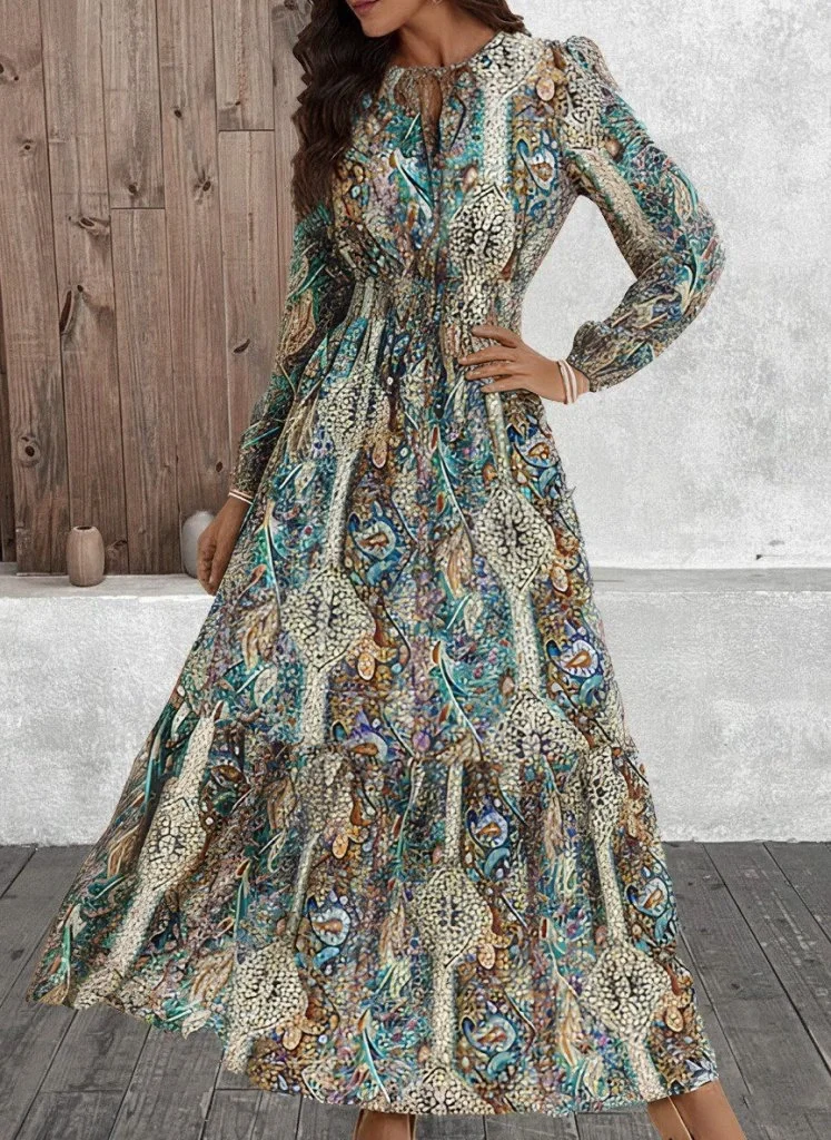 Kadın Uzun Kollu Uakadabağcıklı Beli Lastikli Desenli Uzun Süprem Elbise
