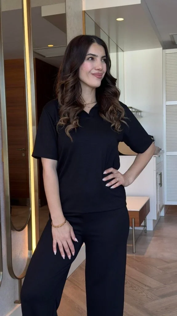 Kadın Kısa Kollu Yakalı Viskon Iki Iplik Bluz Ve Pantolon Ikili Takım