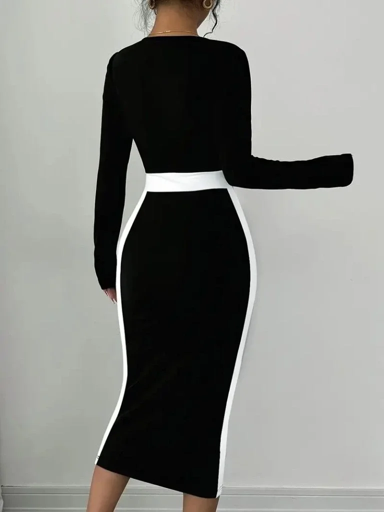 Kadın Uzun Kollu Geometrik Yaka Midi Ithal Krep Elbise