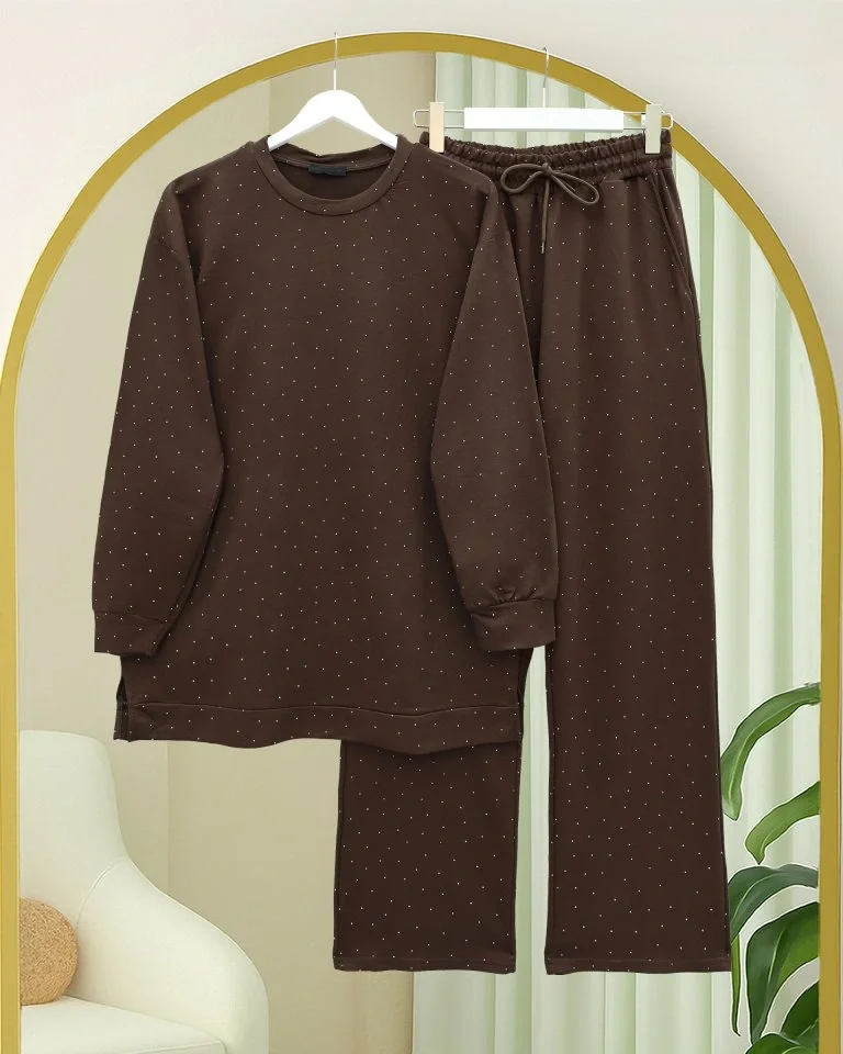 Serpme Taş Detaylı Pantolonlu Oysho Takım -Kahve