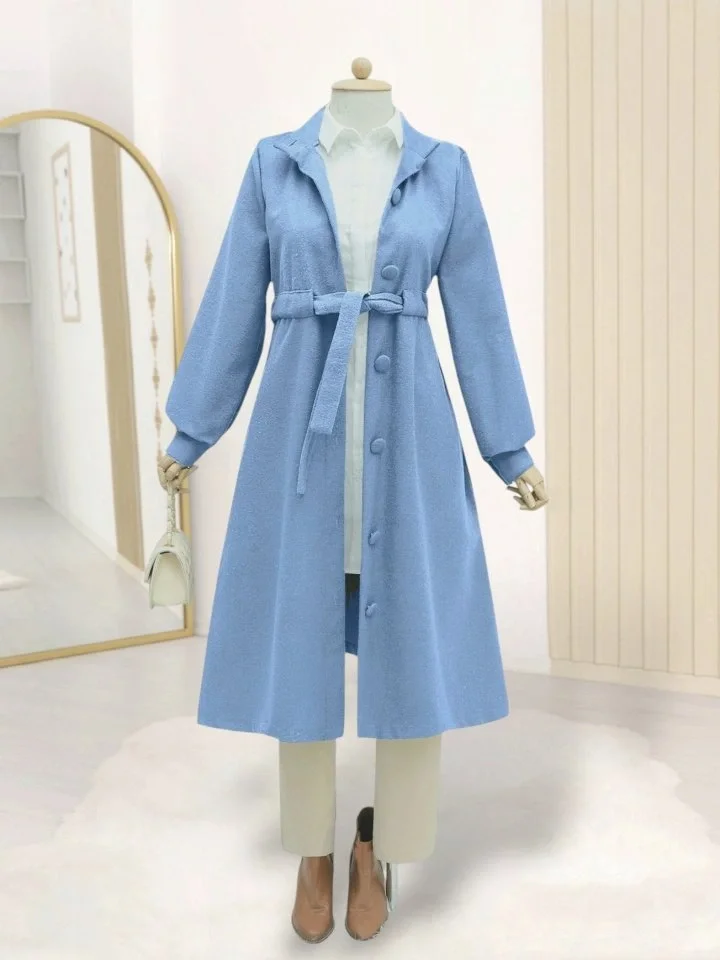 Belden Bağlamalı Top Düğmeli Kaşe Kaban -Mavi