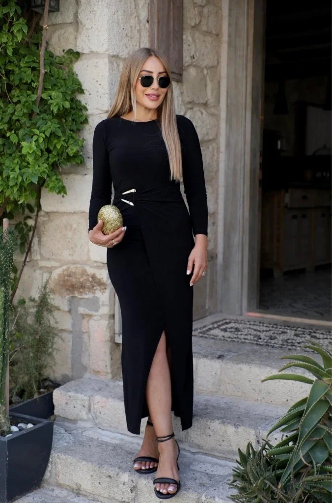 Kadın Truvakar Kollu Bisiklet Yaka Kemersiz Yırtmaç Detaylı Uzun Ithal Krep Elbise