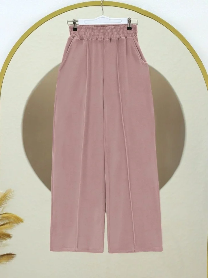 Çımalı Beli Lastikli Kadife Pantolon -Pudra