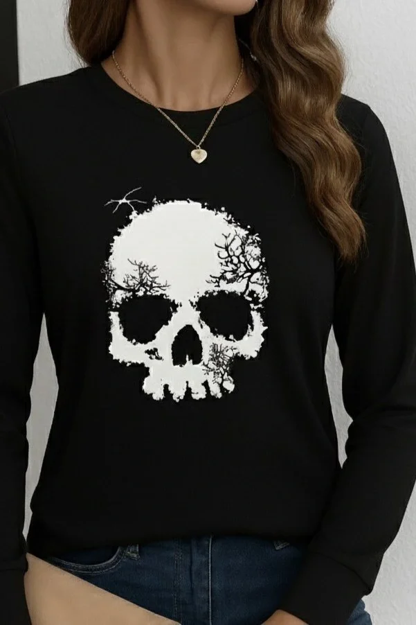 Kadın Uzun Kollu Bisiklet Yaka Kurukafa Desenli Viskon Bluz