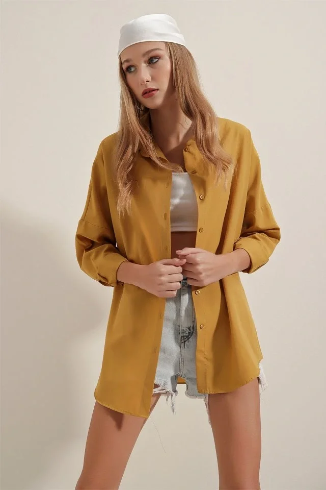 3900 Oversize Uzun Basic Gömlek - Hardal