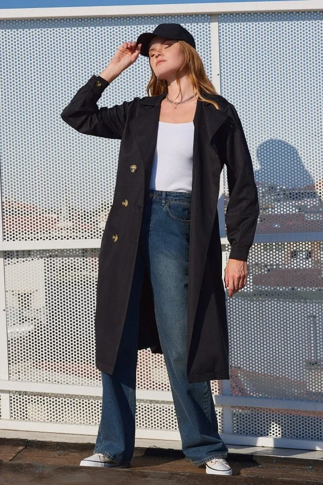 5853 Kruvaze Yaka Trençkot - Siyah